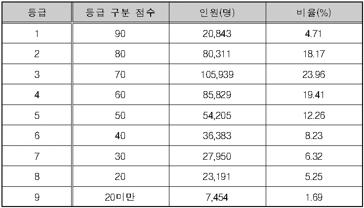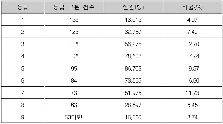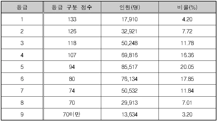 ◆ 1등급의 등급 구분 점수는 65점, 인원은 11,098명으로 비율은 7.08%입니다.